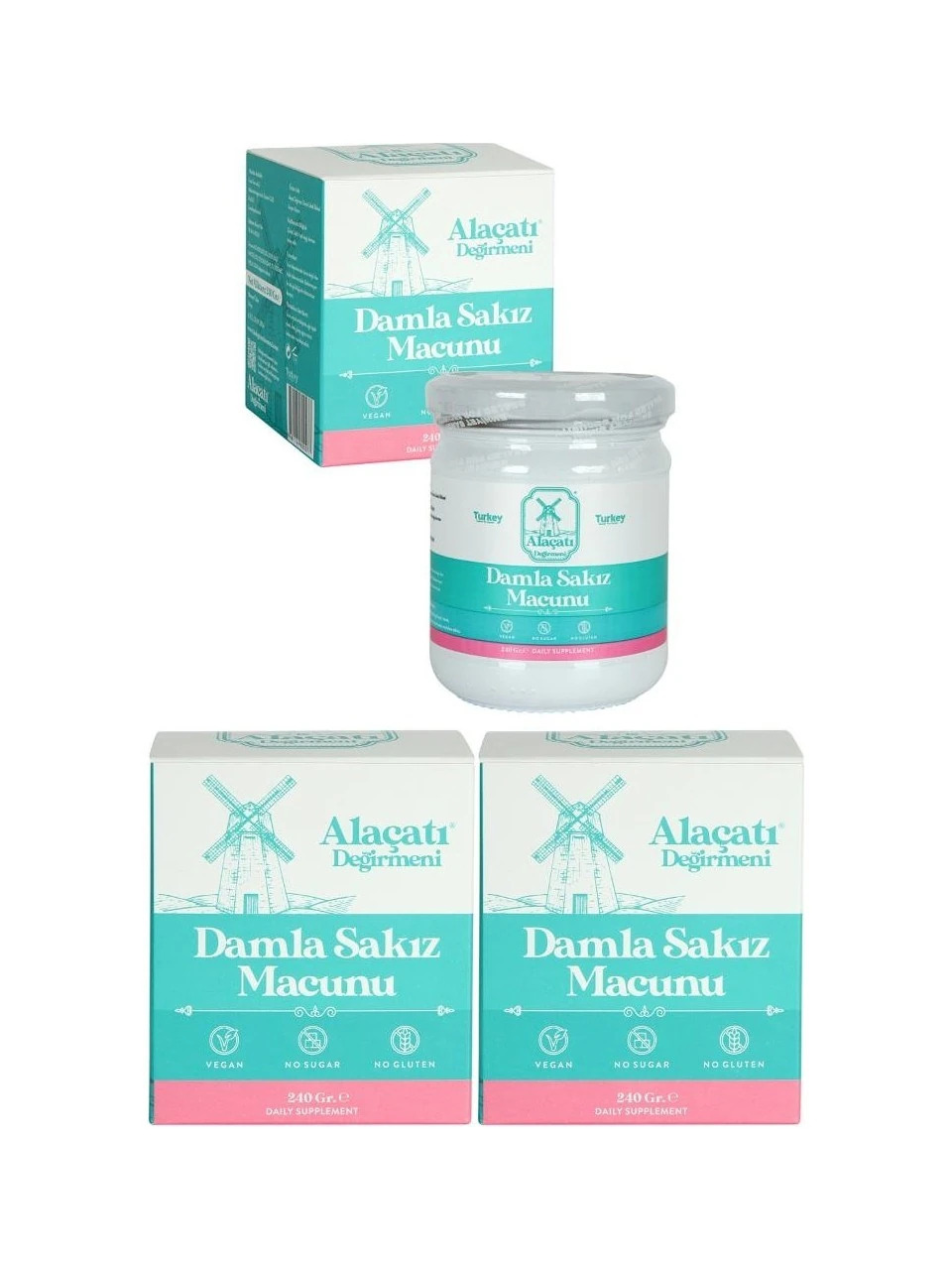 Alaçatı Değirmeni Damla Sakızlı Macun 3 x 240 gr 3'lü Set İçerik : Keçiboynuzu Pekmezi, Andız pekmezi, Kebabiye, Damla sakızı, Acı badem, Günlük, Zerdeçal,
