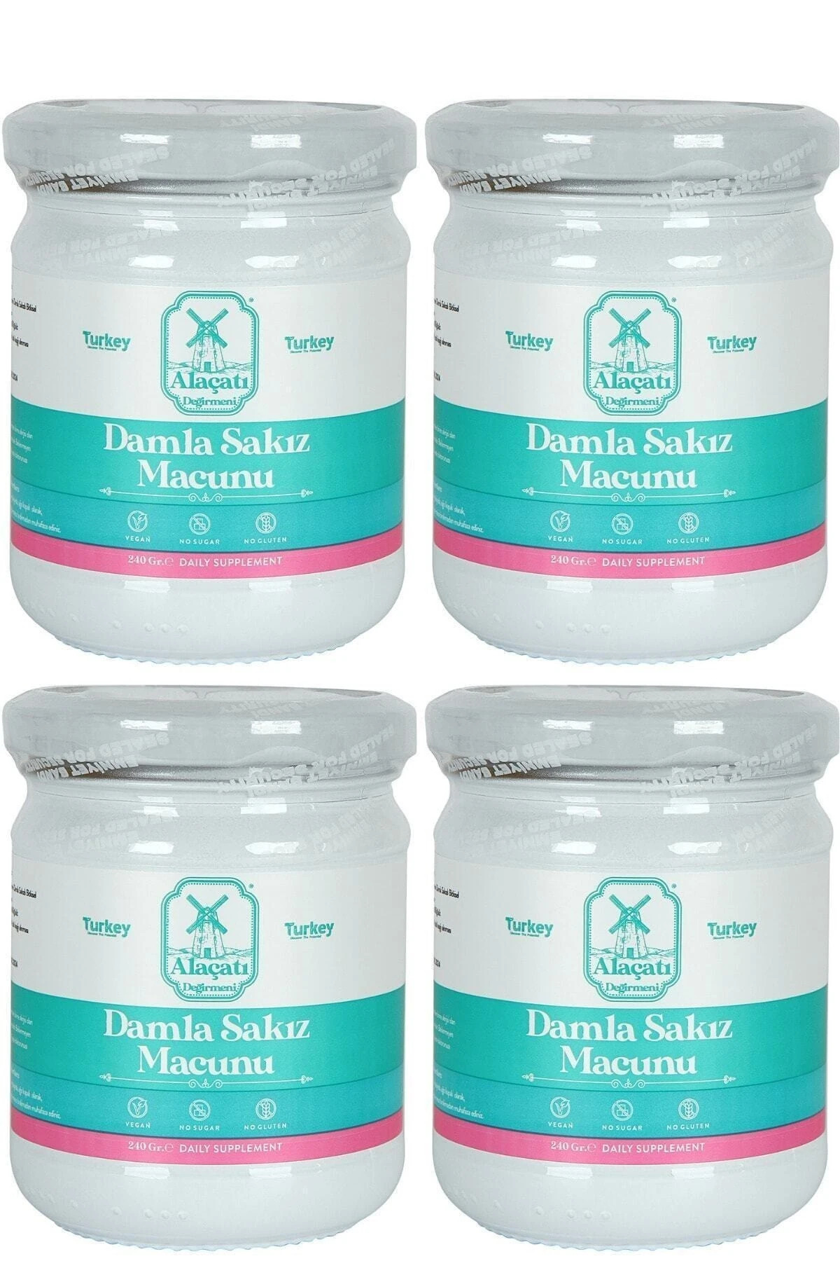 Alaçatı Değirmeni Damla Sakızlı Macun 4 x 240 gr 4'lü Set İçerik : Keçiboynuzu Pekmezi, Andız pekmezi, Kebabiye, Damla sakızı, Acı badem, Günlük, Zerdeçal,