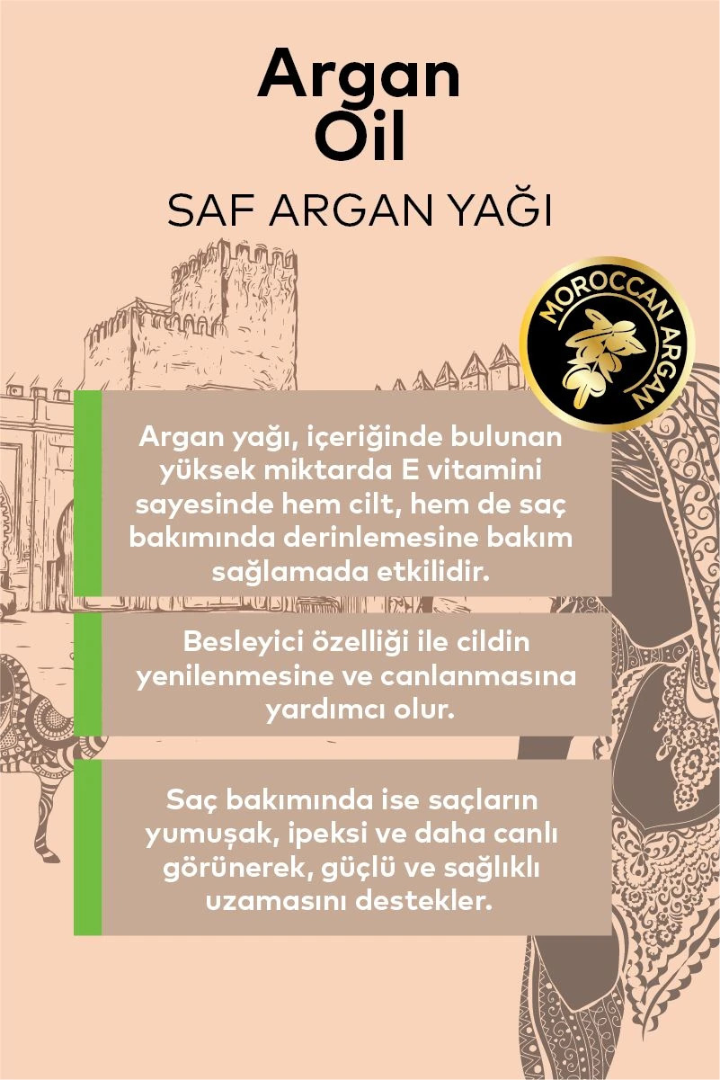 Argan yağı, içeriğinde bulunan yüksek miktarda E vitamini sayesinde hem cilt, hem saç bakımında derinlemesine bakım sağlamada etkilidir. Besleyici özelliği ile cildin yenilenmesine ve canlanmasına yardımcı olur. Saç bakımında ise saçların yumuşak, ipeksi ve daha canlı görünerek, güçlü ve sağlıklı uzamasını destekler.