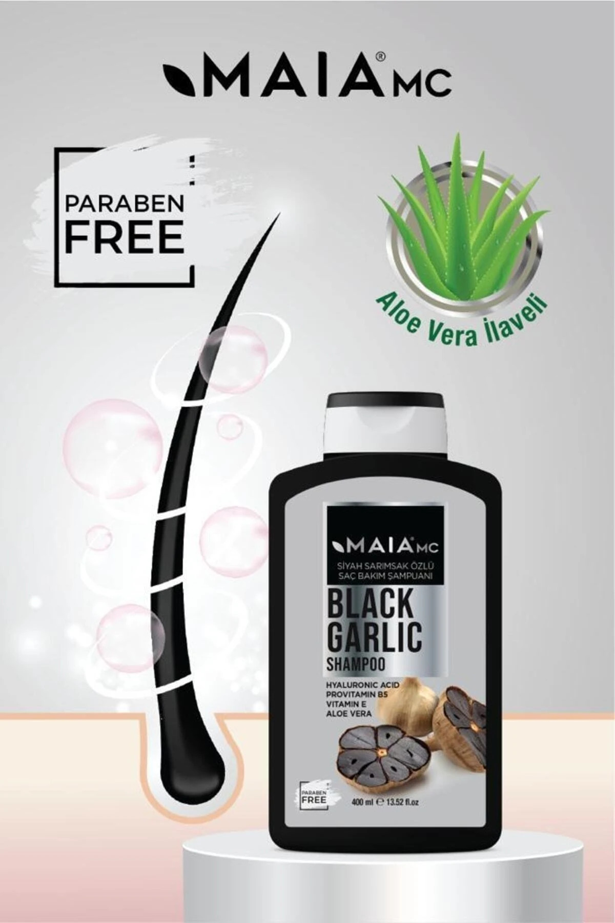 İçeriğindeki siyah sarımsak özü saç dökülmesine karşı güçlü bir etki gösterirken, hyalüronik asit türevi,Vitamin B5, Vitamin E içeren zenginleştirilmiş formülü ile saç yapısını derinlemesine nemlendirir.Saçları dipten uca besleyerek hacim,canlılık ve parlaklık sağlar.
